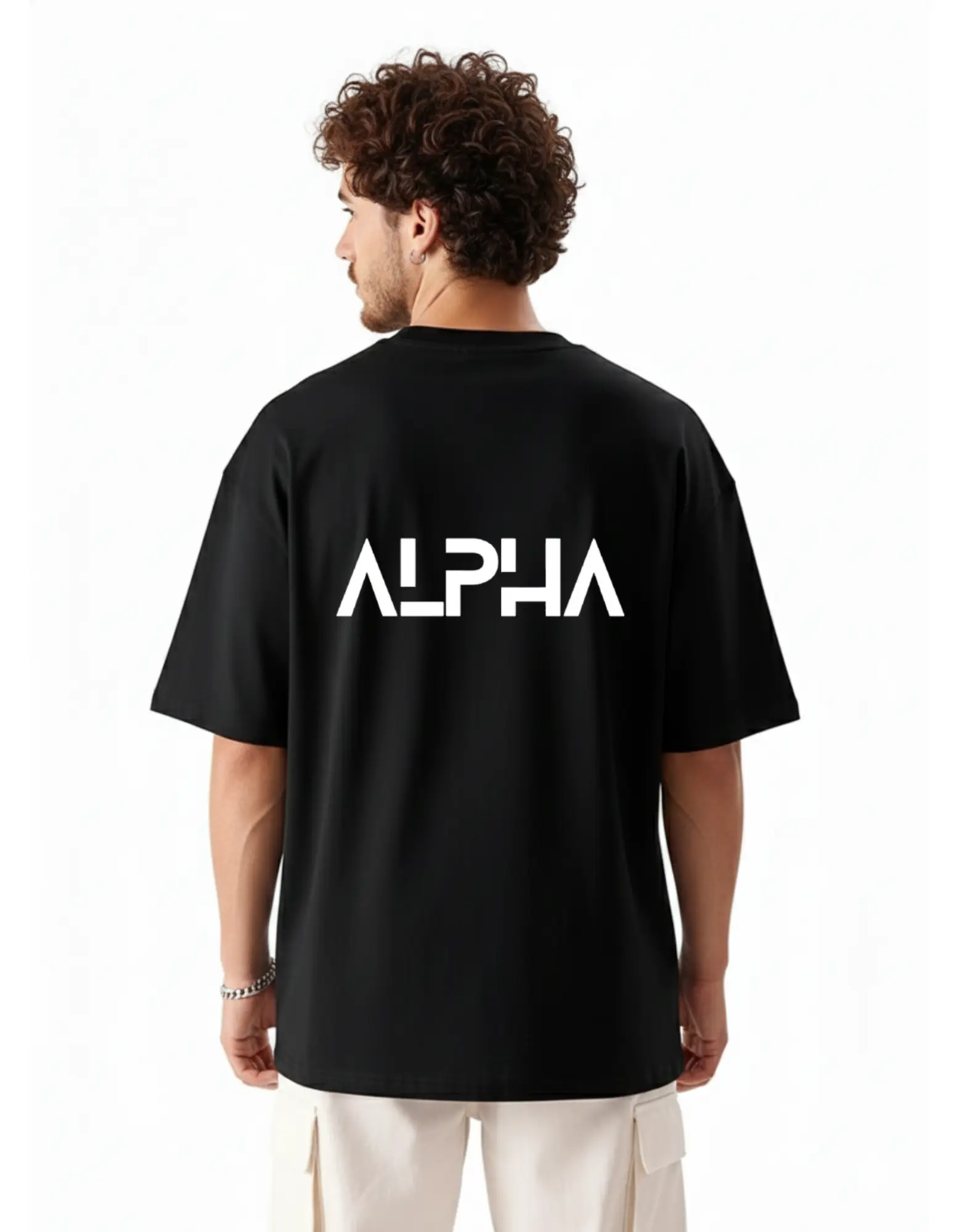 Design: Features a bold, architectural “ALPHA” graphic in a geometric sans-serif font centered across the upper back.