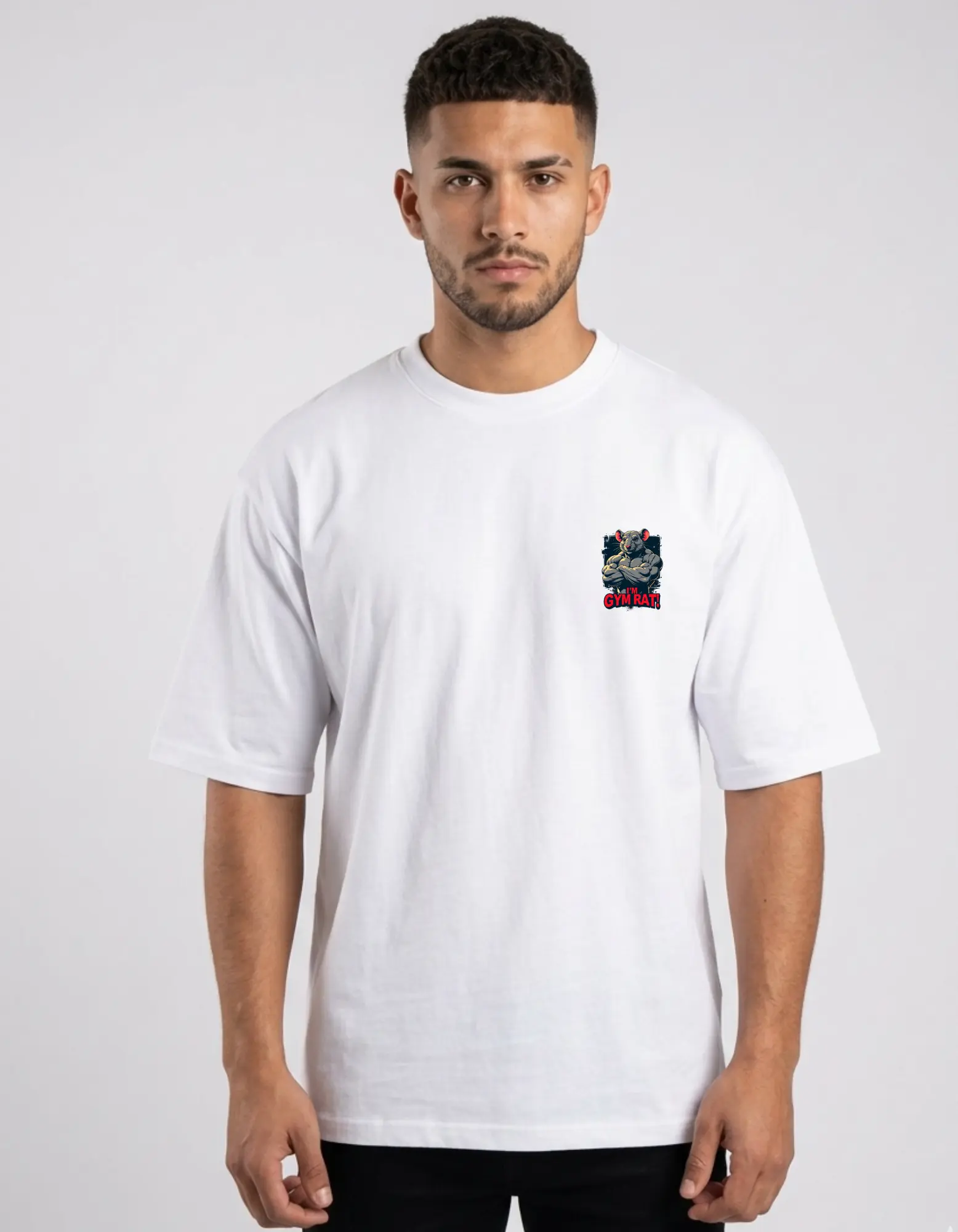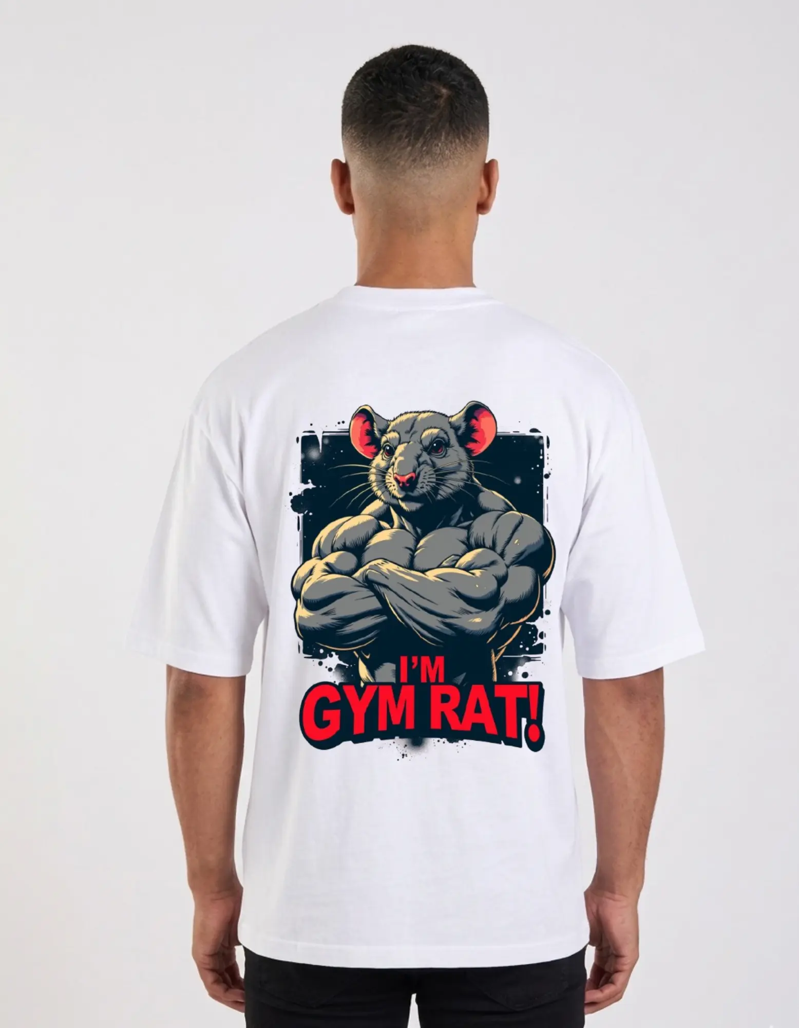 Bold Graphic Art: Features a high-detail “Gym Rat” illustration with aggressive typography that captures the “shredded” mindset.